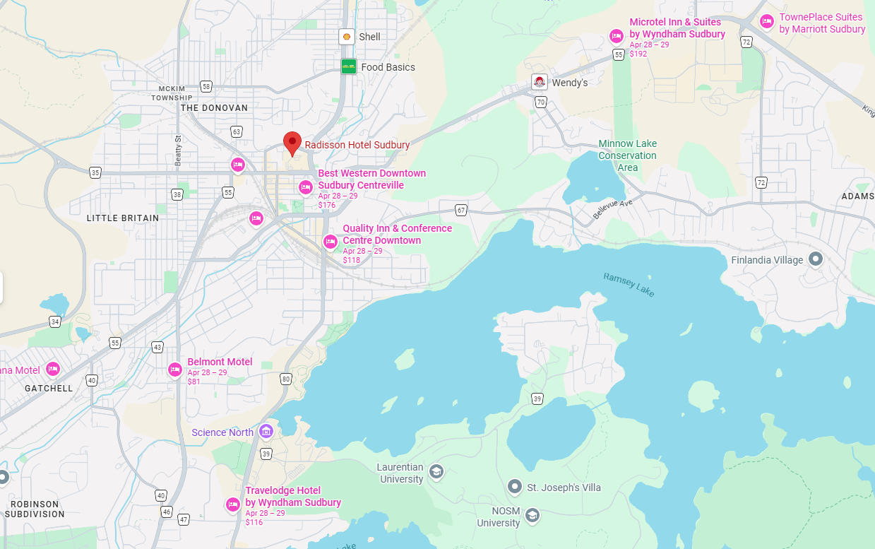Arriving from the Airport: The Greater Sudbury Airport is 24 kms from the Radisson hotel. Shuttle service from the airport is offered by the hotel. Please contact the Radisson reception for further information.