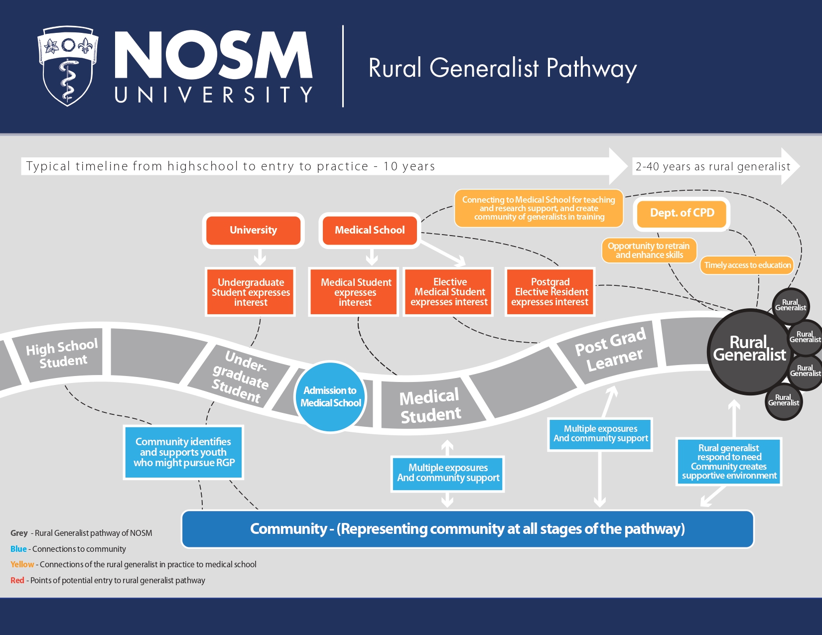 What the pathway isThe Rural Generalist Pathway is a NOSM University initiative that supports learners from entry into medical school through postgraduate training and into early practice. It is a curriculum enrichment that has been running for five years and continues to evolve. The RGP provides a structured set of learning experiences, mentorship, and community connections designed to help learners gain the skills, confidence, and perspective needed to thrive as a rural physician. Starting in first year, learners will be part of a network of faculty, residents, and peers who share a commitment to rural and Northern health. Although the full-pathway from high school to practice as a rural generalist is aspirational, we are working to ensure that by 2027, a fulsome pathway will be realized through incremental changes in each portfolio; a pathway that will allow learners to imagine for themselves a successful career with a rural generalist start. |