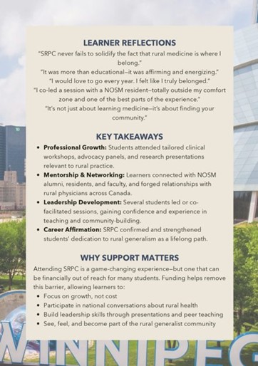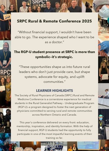 “This was a pivotal experience in my medical education. I have built strong relationships with peers and communities as a result of this. It allowed me to declare early and with certainty my choice to pursue rural medicine. Rural family medicine is so often talked-down on from non-rural providers and I have been told by many people that I am singing up for mayhem, without this program I may have been swayed to pursue a different speciality, however because of my preceptors, peers, and the rural medicine community that I have gotten to know so well, nothing can turn me away and I take pride in calling myself a future rural generalist. This program is essential to continue to train learners that are committed to serve Northern Ontario’s rural and remote communities. ” (AY23-24)